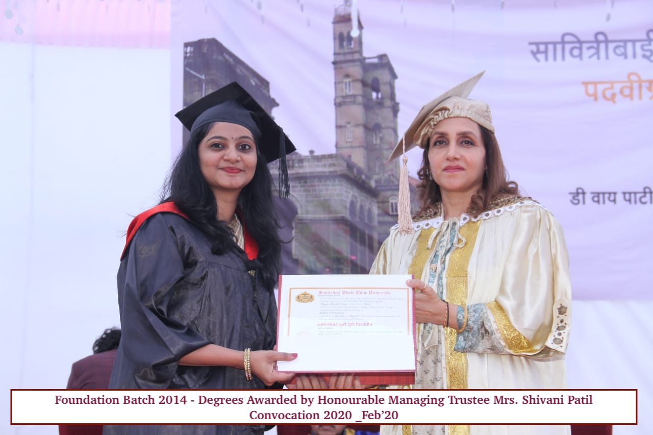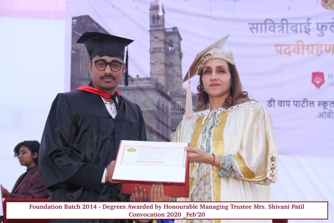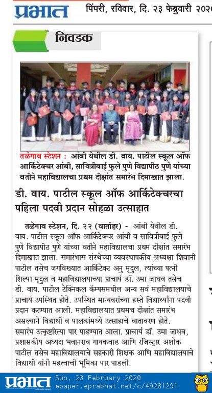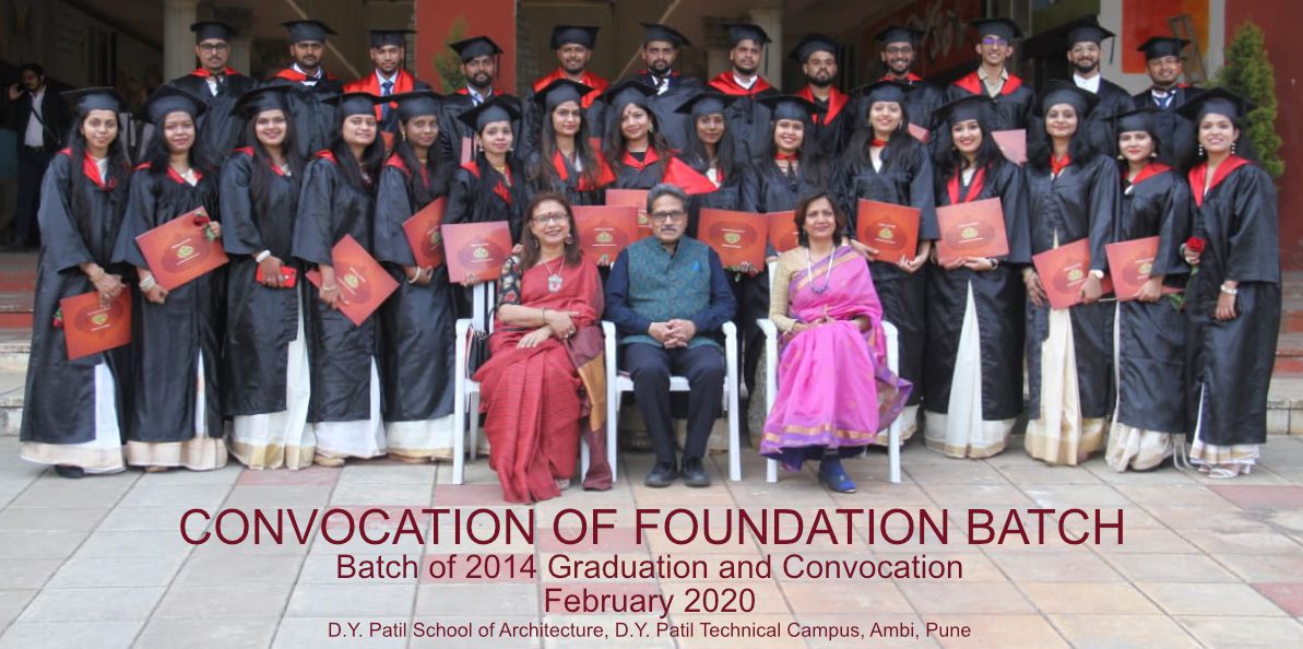 TThe first batch of D. Y. Patil School of Architecture graduated in the year 2020. First Convocation ceremony was organized on Tuesday, 18th February 2020 at 1:00 pm at DYPTC campus, Ambi, Pune